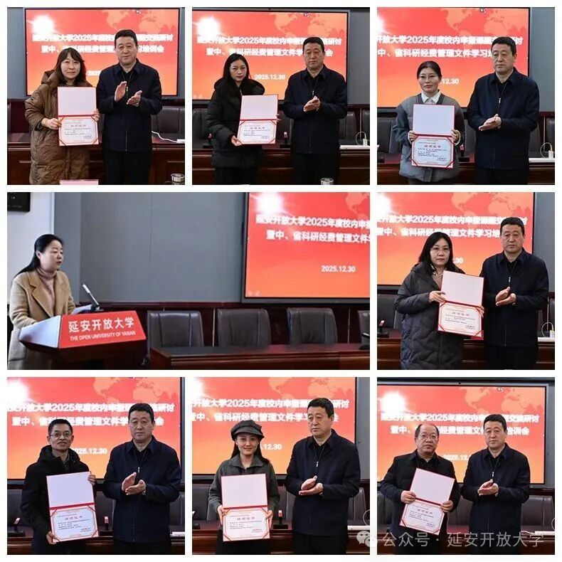 会议为2024年度校内结题的课题组颁发了结题证书;2025年度校内四个立项课题《“智慧助老视阈下虚拟现实技术在老年教育中的应用研究》、《基于‘心身互动疗法’和积极心理学理念的开放教育学员认知觉醒与学习驱动教育创新研究》、《乡村振兴的思想建设与法制化道路》、《延安开放大学5G校园建设标准和实施策略》围绕课题的研究设计、创新点及实施路径等进行了汇报交流;组织全体教师学习了中、省科研经费管理制度的核心要点和内容,强调了规范使用科研经费的重要性与严肃性,提醒全体教师在课题研究过程中要强化责任意识,严守制度红线,保证科研经费使用的合规性、真实性和有效性。
